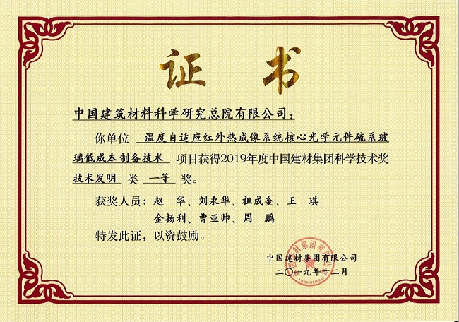 历经十年的技术攻关,中国建材总院开发了系列硫系玻璃产品,并逐渐走出一条从“光学设计-玻璃制备-精密成型-表面镀膜-镜头装调”的全产业链的发展道路,承担国家各类攻关项目4项,累计获授权发明专利14项,并先后获得中国建材集团技术发明一等奖1项,中国建筑材料联合会·中国机械冶金建材工会全国委员会联合颁发的行业技术革新一等奖1项。