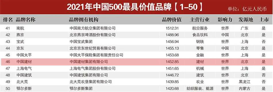 与2020年相比,《中国500最具价值品牌》排名浮动不大,《亚洲品牌500强》稳步提高,位列81名,稳居中国建材行业榜首。年初英国品牌金融咨询公司Brand Finance对外发布的《Brand Finance 2021年全球品牌价值500强》,中国建材集团也是连续第三年入围、提升84个名次、至第269位。