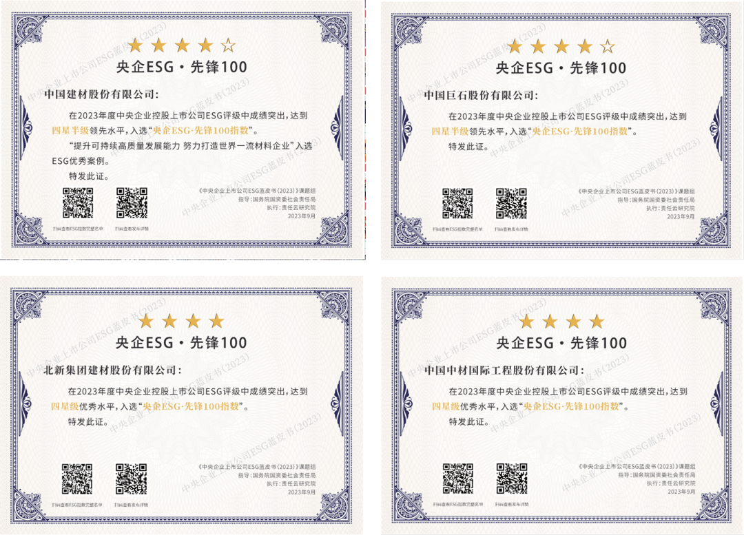 近日,《中央企业上市公司ESG蓝皮书(2023)》及“央企ESG·先锋100指数”榜单发布。集团所属4家上市公司中国建材股份、中国巨石、北新建材和中材国际入选了“央企ESG·先锋100指数”,分别位于第33位,第39位,第87位以及第92位。ESG表现均处于四星级水平以上,是上市公司ESG发展的领先者。中国建材股份案例《提升可持续高质量发展能力 努力打造世界一流材料企业》入选了《中央企业上市公司ESG蓝皮书(2023)》。