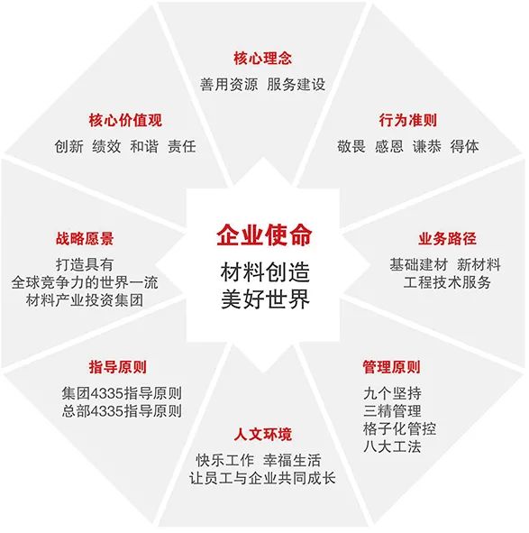 中国建材集团新发布的《企业文化手册》中,增加了“材料创造美好世界”这一企业使命。聚焦在这一使命下,中国建材集团不断通过创新突围、突破,致力于提供高端、智能、环保、安全的高质量产品和高品质服务,推动经济社会更好发展,在加快培育具有全球竞争力的世界一流材料产业投资集团的新征途上奋勇前行、再谱新篇!
