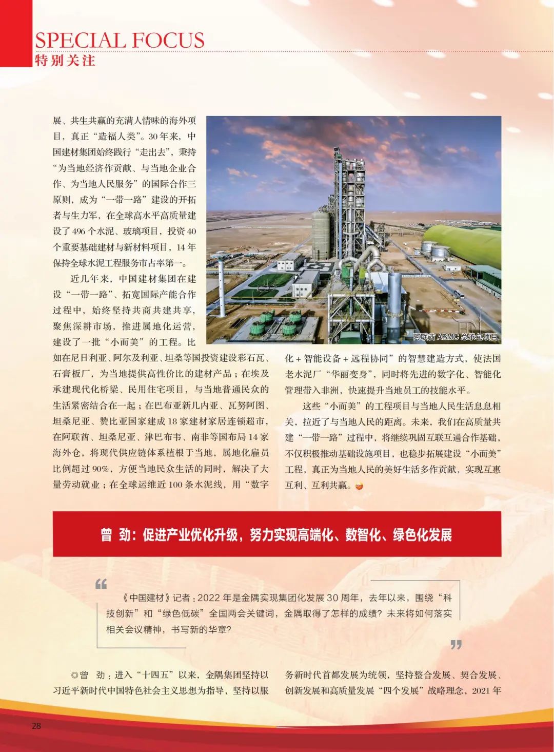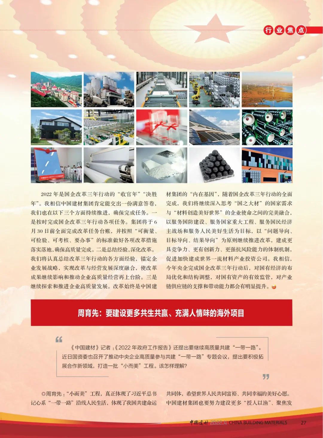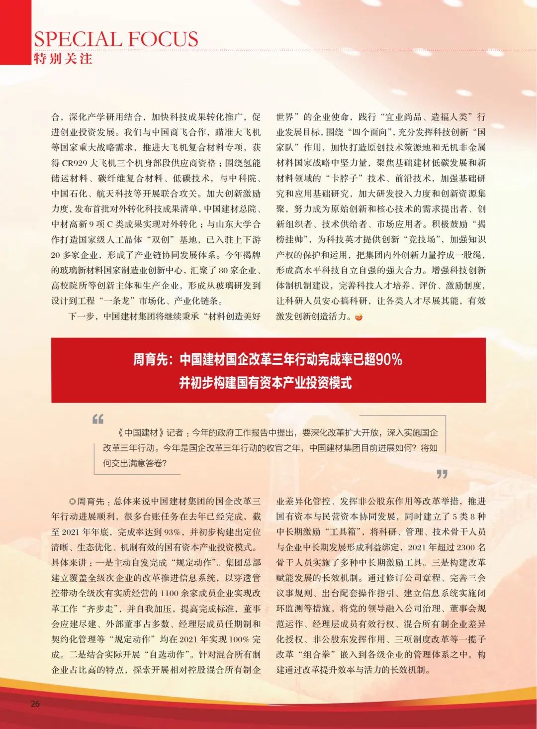 周育先:秉承“材料创造美好世界”使命,充分发挥科技创新“国家队”作用 中国建材作为建材行业唯一央企,拥有26家国家级科研院所、3个国家重点实验室、1个国家制造业创新中心、3.8万名科研人员等雄厚的科研实力,7项国家科技进步一等奖的科研优势及7项业务规模世界第一的产业优势,并入选国资委首批打造中央企业原创技术策源地名单。 中国建材始终心怀“国之大者”,打造“国之大材”。强化企业创新主体地位、强化国家战略科技力量建设,持续推进关键核心技术攻关,攻克了一批国家“卡脖子”技术。例如:碳纤维复合材料、辐照石英玻璃用于“天和号”核心舱,高纯石英玻璃保障“天问一号”,非线性光学晶体KTP用于“墨子号”量子通讯卫星,高强度玻纤、可加工云母陶瓷应用于神舟飞船,空心玻璃微珠作为固体浮力材料用于蛟龙号;攻克高水平放射性核废液玻璃固化世界难题,助力实现我国高放废液处理能力零的突破;低热水泥筑牢乌东德、白鹤滩水电站大坝安全屏障,川藏线工程专用水泥通过试用验证;瓷芯复合绝缘子用于特高压输电工程服务国家电网。 中国建材强化关键基础材料自主保障,实现大批新材料工业化量产,助力增强国家制造业核心竞争力。多个系列高性能玻璃纤维产品量产化,满足电子信息产业、新基建领域对关键材料的技术需求;攻克8.5代TFT-LCD玻璃基板关键技术并稳定量产,实现了我国高世代液晶玻璃基板“零”的突破;百吨级T1000、千吨级T700/T800高端碳纤维成套技术自主可控,西宁万吨碳纤维生产基地投产、入选2021年央企十大工程;百余款全系列风电叶片产品满足陆地、海上不同场景需求;还有中性硼硅药用玻璃、发电玻璃、图像光导识别材料、氮化硅陶瓷、锂电池隔膜、人工晶体等一大批新材料工业化量产,成为助力国家战略创新的行业平台和重要力量,维护产业链供应链安全稳定。 中国建材强化创新链产业链深度融合,深化产学研用结合,加快科技成果转化推广,促进创业投资发展。与中国商飞合作,瞄准大飞机等国家重大战略需求,推进大飞机复合材料专项,获得CR929大飞机三个机身部段供应商资格;围绕氢能储运材料、碳纤维复合材料、低碳技术,与中科院、中国石化、航天科技等开展联合攻关。加大创新激励力度,发布首批对外转化科技成果清单,中国建材总院、中材高新9项C类成果实现对外转化;与山东大学合作打造国家级人工晶体“双创”基地,已入驻上下游20多家企业,形成了产业链协同发展体系。今年揭牌的玻璃新材料国家制造业创新中心,汇聚了80家企业、高校院所等创新主体和生产企业,形成从玻璃研发到设计到工程“一条龙”市场化、产业化链条。 下一步,中国建材集团秉承“材料创造美好世界”的企业使命,围绕“四个面向”,充分发挥科技创新“国家队”作用,加快打造原创技术策源地和无机非金属材料国家战略中坚力量,聚焦基础建材低碳发展和新材料领域的“卡脖子”技术、前沿技术,加强基础研究和应用基础研究,加大研发投入力度和创新资源集聚,努力成为原始创新和核心技术的需求提出者、创新组织者、技术供给者、市场应用者。积极鼓励“揭榜挂帅”,为科技英才提供创新“竞技场”,加强知识产权的保护和运用,把集团内外创新力量拧成一股绳,形成高水平科技自立自强的强大合力。强化科技创新体制机制建设,完善科技人才培养、评价、激励制度,让科研人员安心搞科研,让各类人才尽展其能,有效激发创新创造活力。 周育先:中国建材国企改革三年行动完成率已达93%,并初步构建国有资本产业投资模式 总体来说中国建材的国企改革三年行动进展顺利,很多台账任务在去年已经完成,截至2021年底,完成率达到93%,并初步构建出定位清晰、生态优化、机制有效的国有资本产业投资模式。具体来讲有:一是主动自发完成“规定动作”。集团总部建立覆盖全级次企业的改革推进信息系统,以穿透管控带动全级次有实质经营的1100余家成员企业实现改革工作“齐步走”,并自我加压、提高完成标准,董事会应建尽建、外部董事占多数、经理层成员任期制和契约化管理等“规定动作”均在2021年实现100%完成。二是结合实际开展“自选动作”。针对混合所有制企业占比高的特点,探索开展相对控股混合所有制企业差异化管控、发挥非公股东作用等改革举措,推进国有资本与民营资本协同发展,同时建立了5类8种中长期激励“工具箱”,将科研、管理、技术骨干人员与企业中长期发展形成利益绑定,2021年超过2300名骨干人员实施了多种中长期激励工具。三是构建改革赋能发展的长效机制。通过修订公司章程、完善三会议事规则、出台配套操作指引、建立信息系统实施闭环监测等措施,将党的领导融入公司治理、董事会规范运作、经理层成员有效行权、混合所有制企业差异化授权、非公股东发挥作用、三项制度改革等一揽子改革“组合拳”嵌入到各级企业的管理体系之中,构建通过改革提升效率与活力的长效机制。 2022年是国企改革三年行动的“收官年”“决胜年”。我相信中国建材肯定能交出一份满意答卷,我们也在以下三个方面持续推进,确保完成任务。一是按时完成国企改革三年行动各项任务。中国建材将于6月30日前全面完成改革任务台账,并按照“可衡量、可检验、可考核、要办事”的标