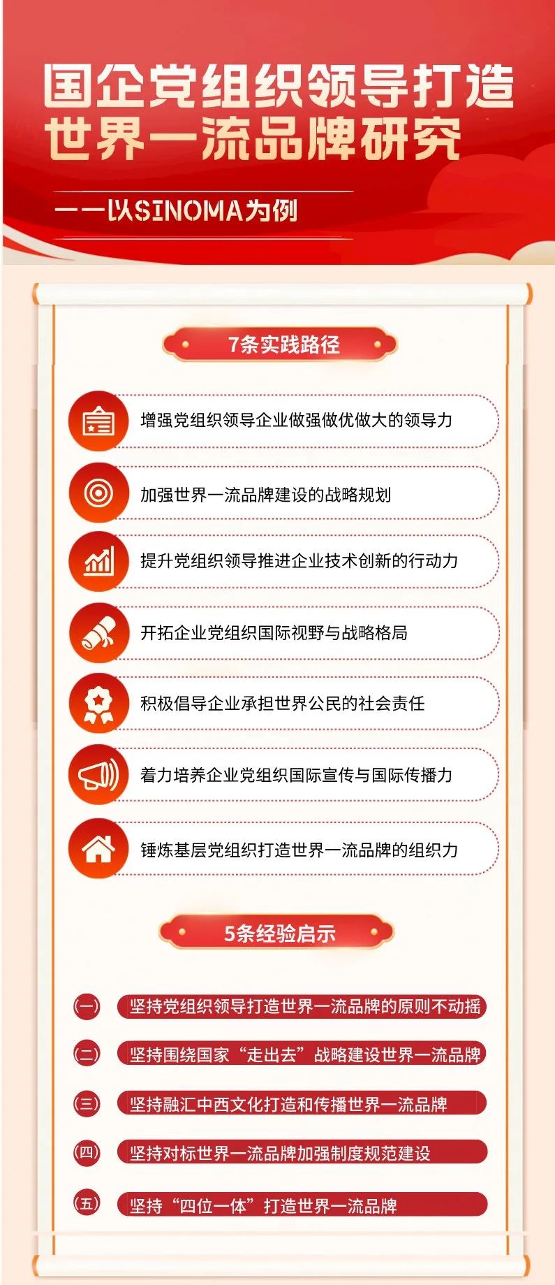 一等奖课题:国企党组织领导打造世界一流品牌研究——以SINOMA为例 《国企党组织领导打造世界一流品牌研究——以SINOMA为例》课题基于中材国际打造SINOMA品牌的实践,总结归纳出国企党组织领导打造世界一流品牌的七条实践路径,即增强党组织领导力、加强品牌战略规划、提升技术创新行动力、开拓国际视野、承担社会责任、培育国际传播力、锤炼基层组织力。课题最后从战略高度和理论高度总结出国企党组织领导打造世界一流品牌的五条经验启示,为国企打造世界一流品牌提供了参考借鉴。 三等奖课题:传承弘扬企业家精神、科学家精神和工匠精神实践研究——以中国建材总院为例 《传承弘扬企业家精神、科学家精神和工匠精神实践研究——以中国建材总院为例》课题基于中国建材总院所处的时代方位,梳理企业家精神、科学家精神和工匠精神的发展脉络,以经验为基础,以问题为导向,总结归纳出传承弘扬的实践路径,即以总院“1335”党建工作体系为统领,全面推进思想建设、组织建设和文化建设,坚持产业自信,坚持创新自信,坚定文化自信,在激发个体生命力中实现企业家精神、科学家精神和工匠精神的升华,由此,构建起国家一社会一企业一个人四位一体的弘扬模式,在培育青年人才坚定建设科技强国,心系“国之大者”,打造“国之大材”的担当与成就,在矢志报国的道路上行稳致远具有重要意义。 围绕国资央企改革发展和党的建设中心工作,开展党建课题研究工作是中国建材集团提升党建工作、推动理论创新的积极探索。下一步,中国建材集团持续深入学习贯彻习近平新时代中国特色社会主义思想和党的二十大精神,贯彻落实《中共中央 国务院关于新时代加强和改进思想政治工作的意见》,坚持问题导向、目标导向,紧跟时代要求,紧贴企业实际,不断推进理论创新和实践创新,为加快建设世界一流材料产业投资集团提供有力理论支撑和坚强思想保证。