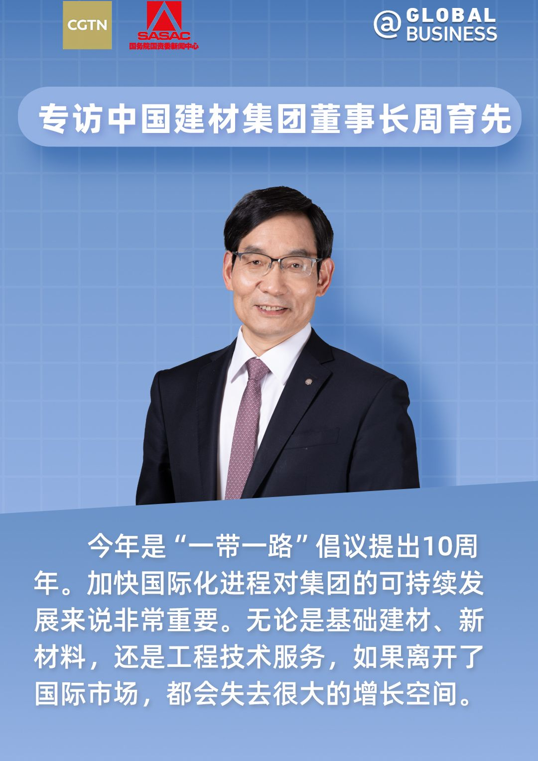 来源:CGTN、集团党委宣传部 发布时间:2023-10-18“一带一路”倡议提出十周年之际,国务院国资委新闻中心联合中国国际电视台(CGTN)策划年度重点访谈节目《丝路新国企》,共话中央企业十年间在海外的融合与发展。10月17日,“一带一路”国际合作高峰论坛期间,CGTN新媒体平台和电视台先后播出了与中国建材集团党委书记、董事长周育先的专访,下面跟随小料一起看看吧~