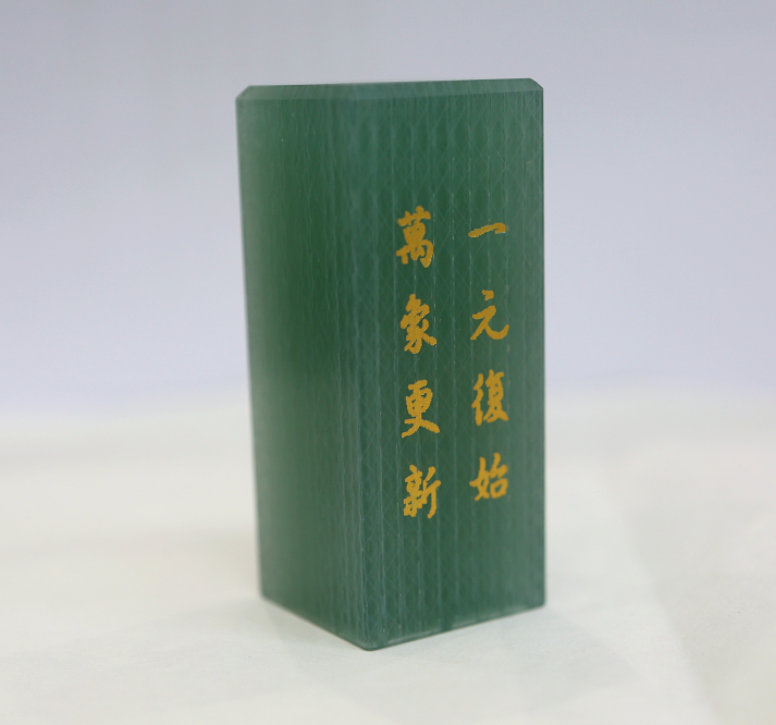 材料简介:以玻璃纤维和环氧树脂为材质,将现代科技与传统文化相融合,采用真空灌注之工艺,精工打磨,制成此印章。表面光润,色泽温和,晶莹剔透,宛若玉石,同时,结构细密,不易破损。