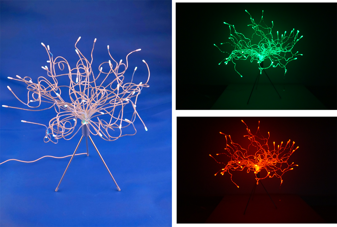 光纤灯主要由发光的塑料光纤和瓷质光源底座组成,塑料光纤和铝丝配合,柔软耐折,可随意造型定型,在长度方向上刻出需要的发光点。颜色可呈现出红、绿、蓝单色光及其变化的复合光,呈现出五光十色、美轮美奂的视觉体验。光纤一端集为一束,寓意中国建材集团所属企业紧密团结在一起,协作一心,成就事业。光纤另一端发散为无数长短不一的闪光点,寓意不同岗位的员工在各自的工作中奋力拼搏,散发出积极向上的光芒。光纤灯可以随意造型定型,象征着创新、创造,以科技引领未来,拥抱无限可能。白色瓷质底座,给人挺拔稳健、积极向上、奋发图强的感觉。
