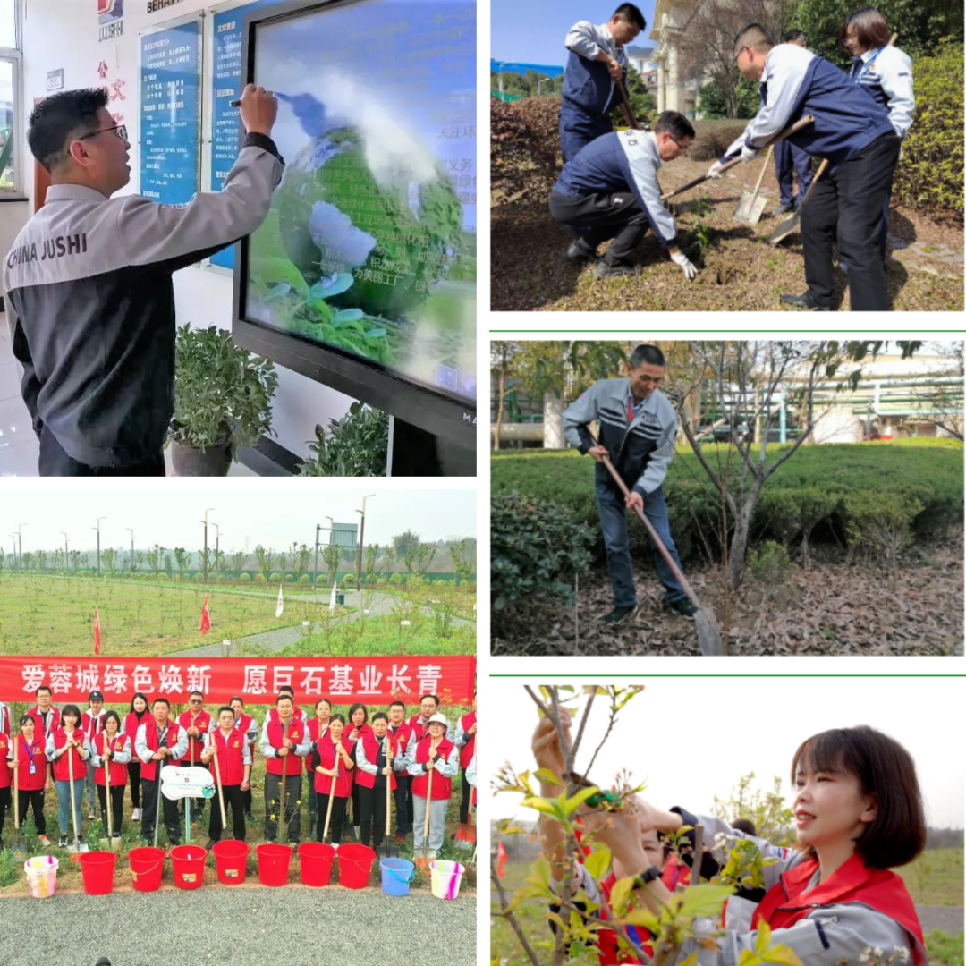 巨石谱写了植树“三部曲”——爱绿、植绿、护绿,树立绿色低碳的意识,爱护身边的一片绿,从一份份爱绿护绿的倡议书开始,从思想抓起。从桐乡到成都,巨石人相互配合、分工明确,一锹土、一桶水,从挖坑、扶苗、覆土、浇水、压实再到修枝,大家种植绿色公益林,为工厂撒播新绿,集中清理碎石、垃圾、枯枝,让绿地更加纯粹,焕然一新。