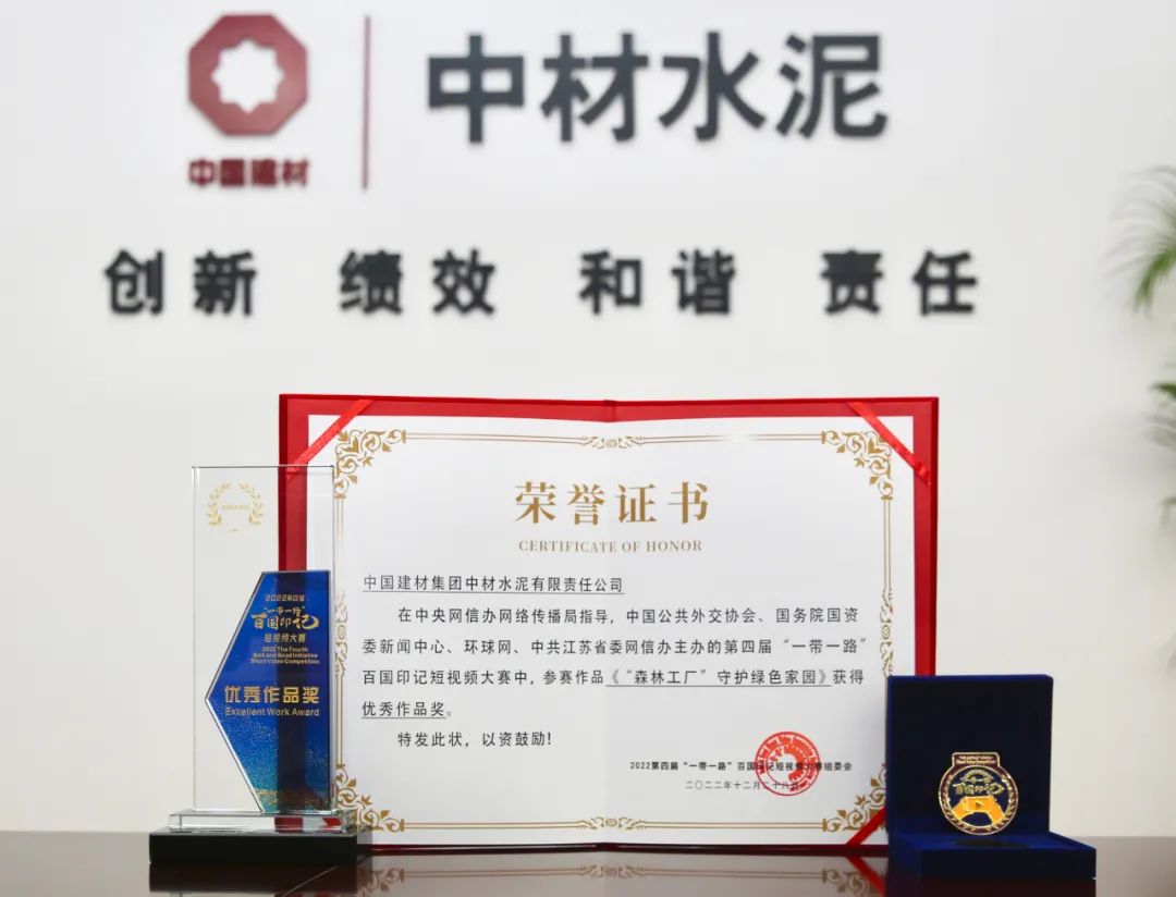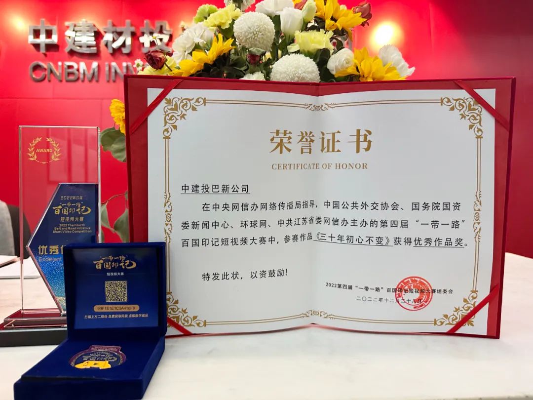 这是我们连续第四年获奖“一带一路”百国印记短视频大赛了!“一带一路”百国印记短视频大赛是由中国公共外交协会、国务院国资委新闻中心和环球网联合主办。中国建材集团申报的中材水泥短视频作品《“森林工厂”守护绿色家园》、中建投巴新短视频作品《三十年初心不变》荣获“优秀作品奖”。