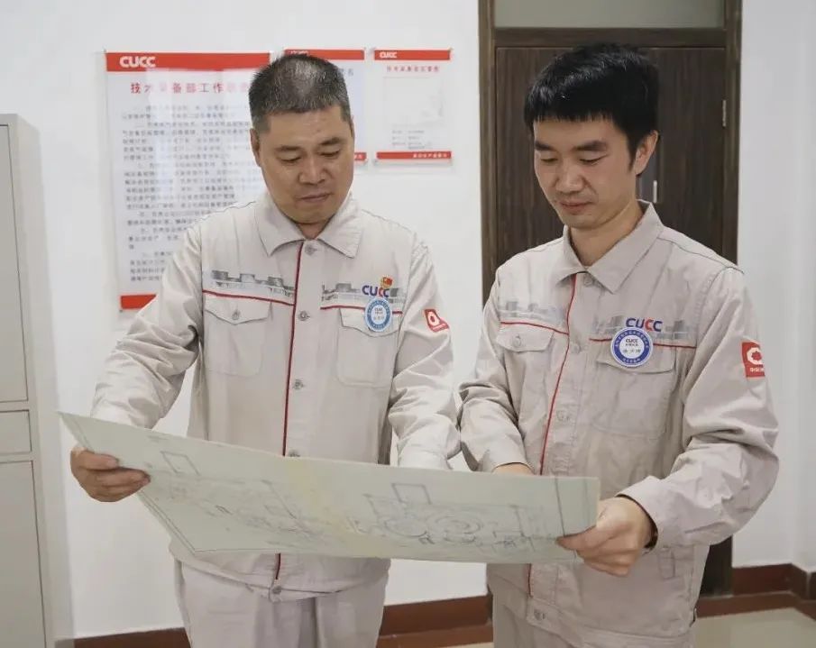 卧龙中联技术装备部杨国华(左)给徒弟杨少坤讲解设备、工艺图纸。