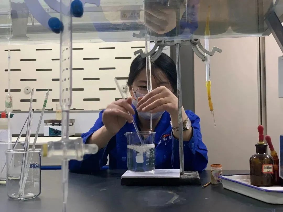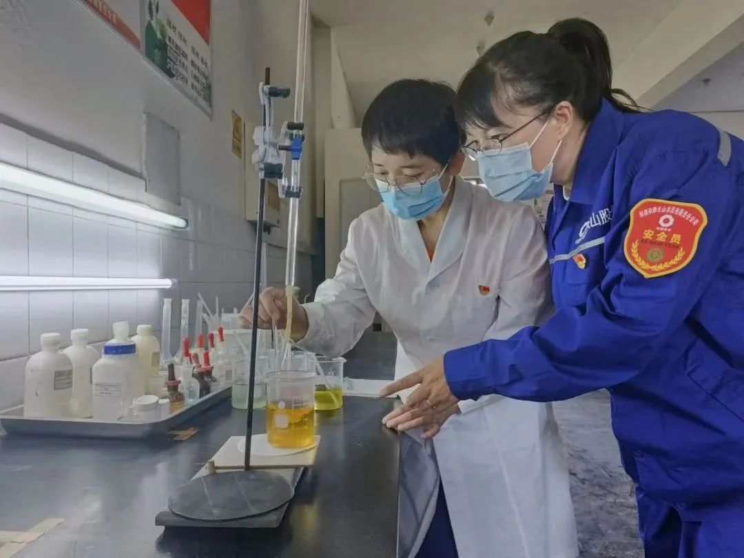 卧龙中联化验室高华茹(左)给徒弟尤晓茹(右)讲解滴定方法。
