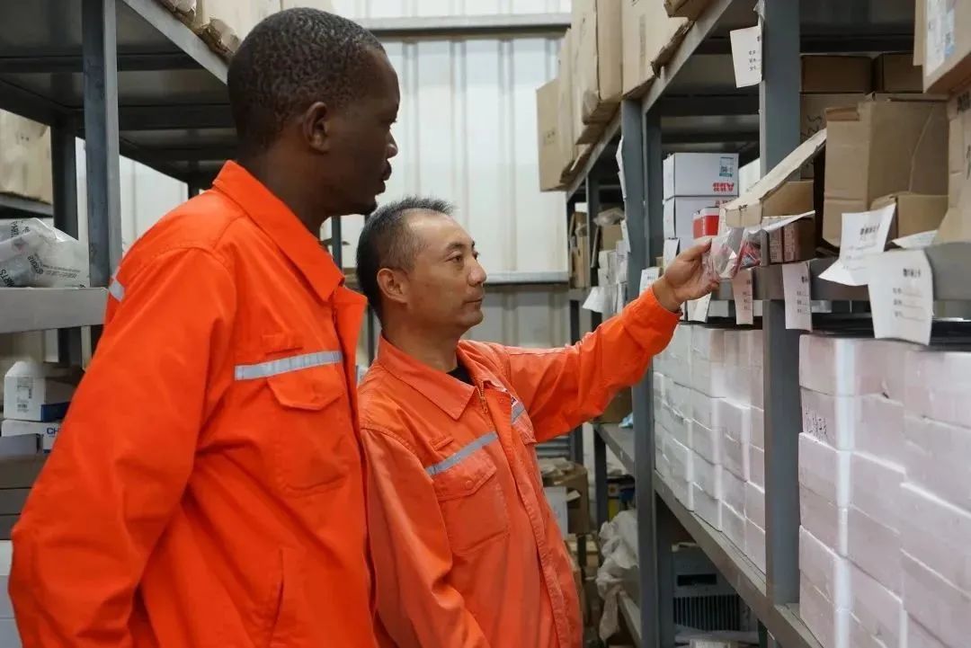 中国建材赞比亚工业园采购主管正在认真地为本地员工讲解仓库物资分类方法及管理规范。