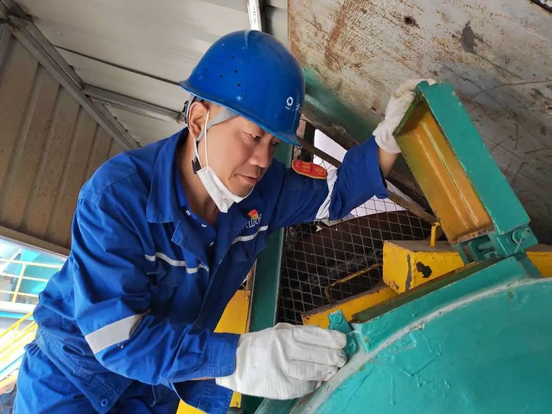 阿克苏天山公司烧成车间,检修工康文强正在排查设备故障。