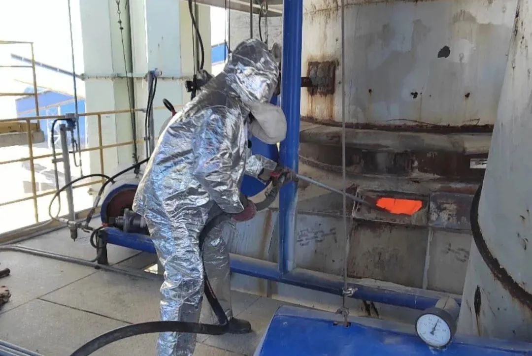 蒙欣巴音嘎拉有限责任公司员工正在预热器清理烟室积料。