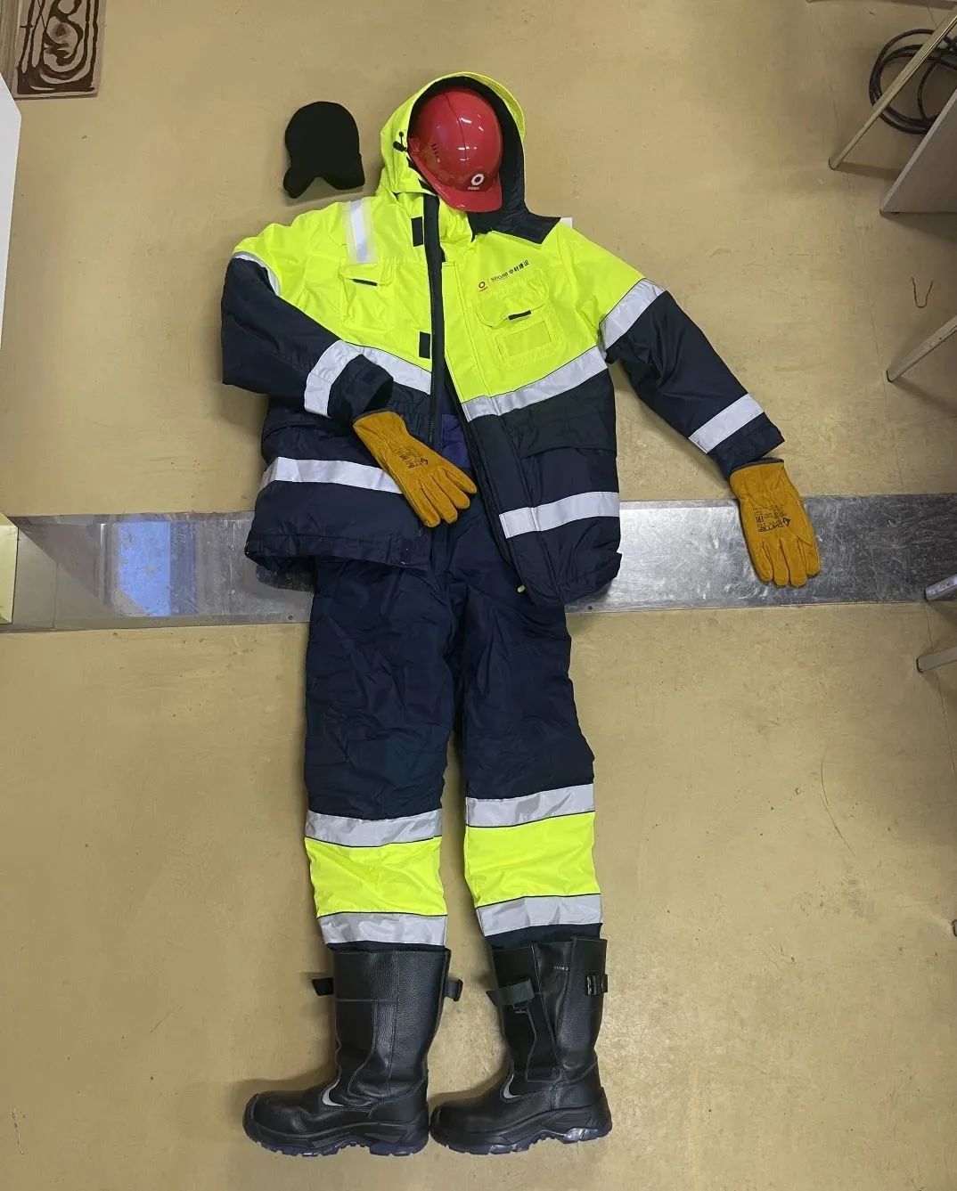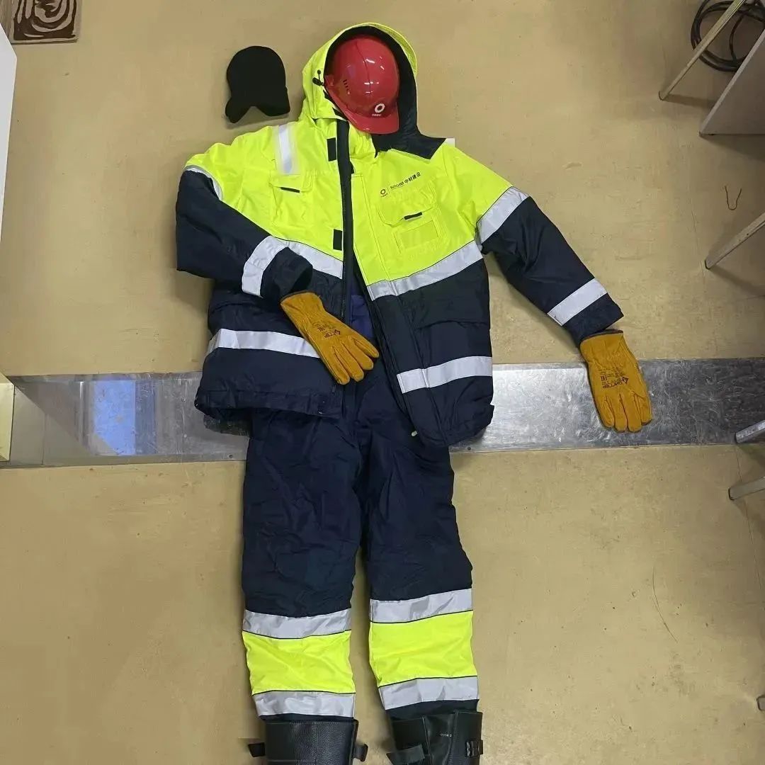 醒目荧光黄搭配大气深海蓝附有银灰色反光饰条,体现着稳重,坚韧,时尚。上衣双层设计,外壳防风防水,内胆加厚保暖,高筒劳保鞋纯皮加绒又防滑,为建材职工在俄罗斯冬季施工提供强有力的保暖支持。