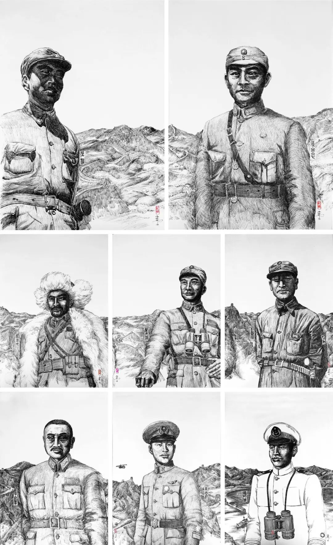 成都建材院冯延伟创作的钢笔画《抗日殉国名将系列组画》中八位名将分别是八路军左权、西北军张自忠、东北抗联杨靖宇、远征军戴安澜、新四军彭雪枫、川军王铭章、空军高志航、海军萨师俊。他们出身背景各有特色,正好凸显万众一心众志成城,天南海北结成广泛爱国统一战线共御外侮所取得的艰苦卓绝的胜利。作者致以崇高敬意,抗日殉国将士永垂不朽!